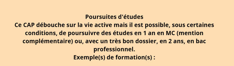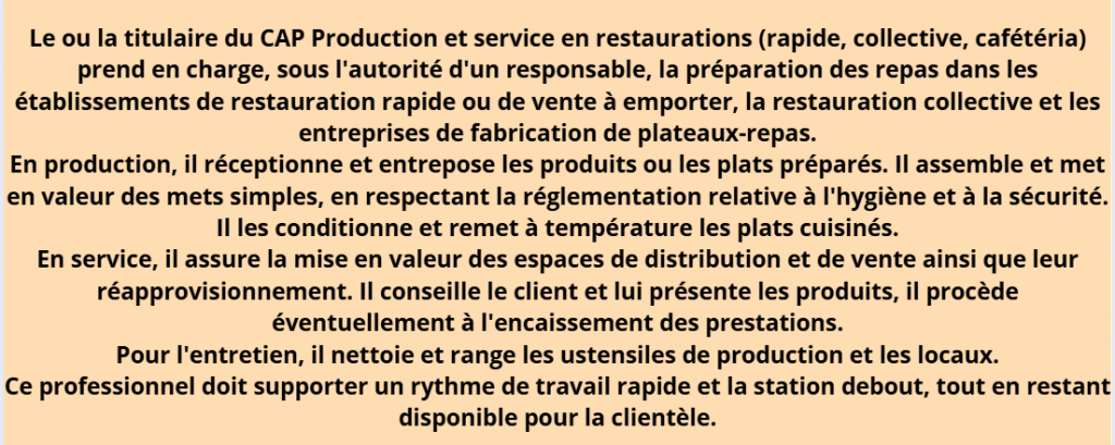 CAP Production et service en restauration (rapide,collective, cafétéria) MC Cuisinier en desserts de restaurant MC Employé barman Bac pro Commercialisation et services en restauration MC sommellerie